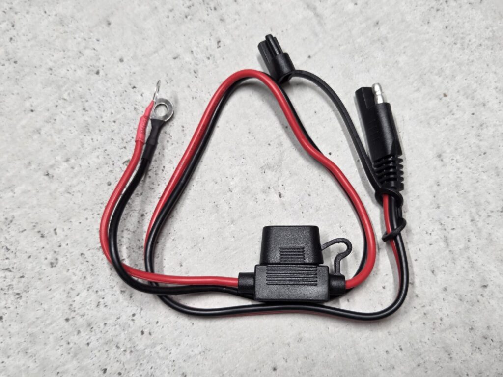 SAEコネクタをバッテリーに繋ぐ場合、端子が露出している方(写真だと右側)をマイナスに繋いでください。