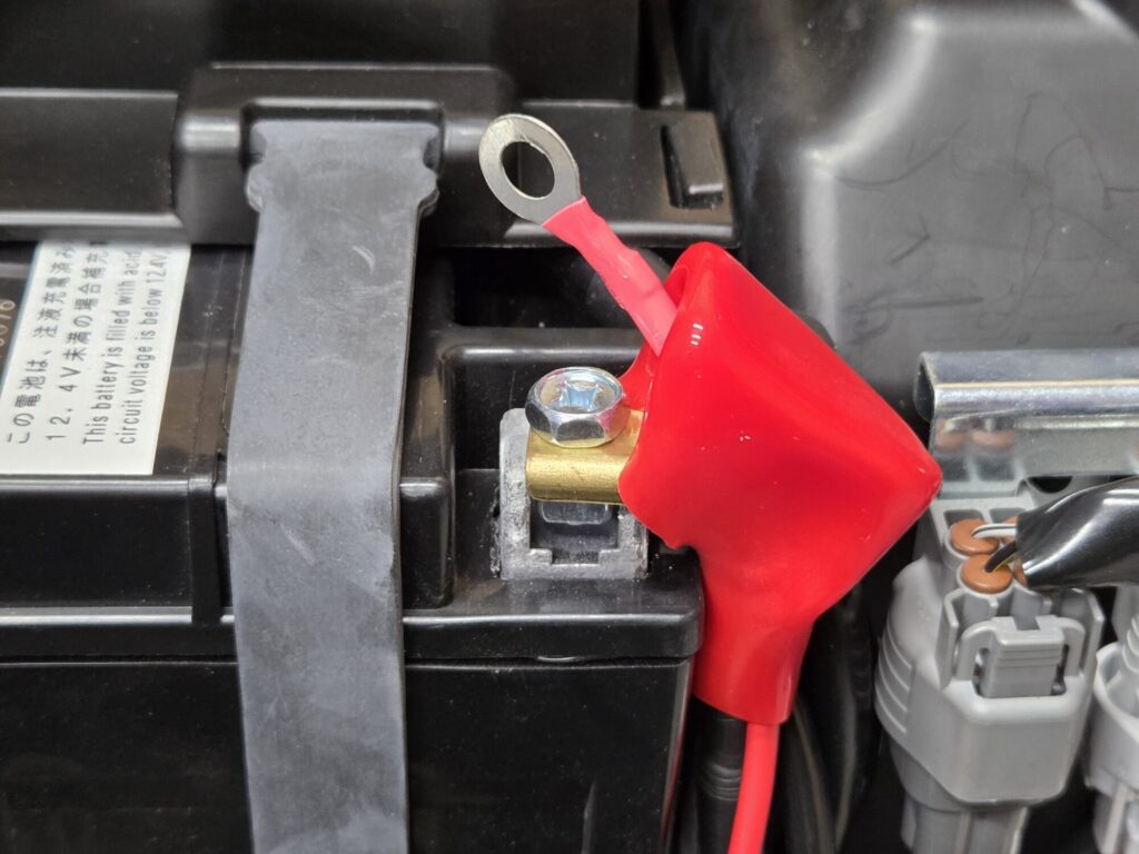 バッテリーのプラス端子を保護している赤いカバーに、SAEコネクタのプラス側の丸端子を通して、プラス端子に共締めします。